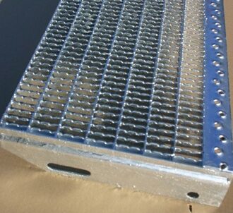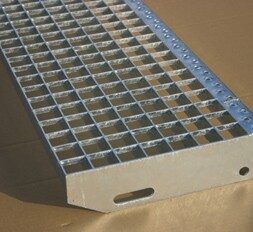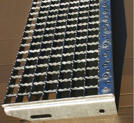 EP-Gitterrost-Stufen mit Gleitschutz verzinkt, mit Sicherheitskante und seitlichen Anschraublaschen, DIN 24531