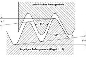 Der Flankenwinkel misst 55°, gegenüber 60° bei metrischen Gewinden (siehe Skizze unten).