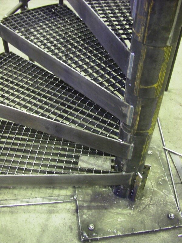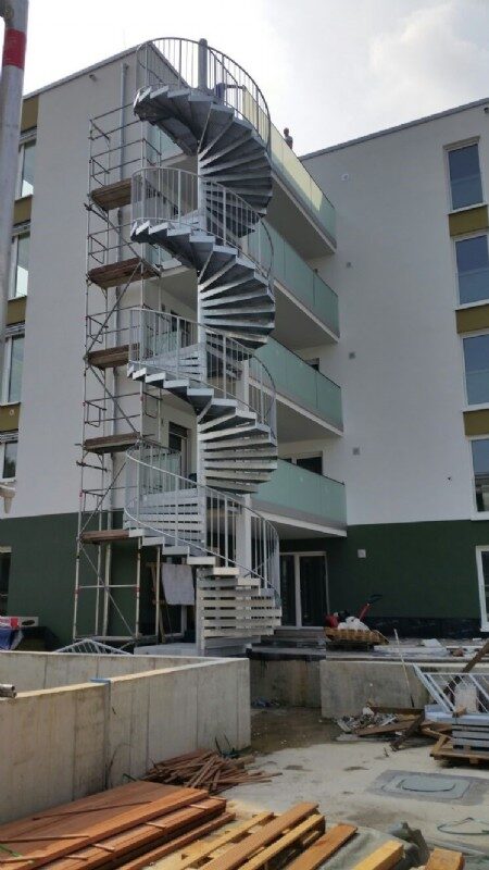 Sie wird, je nach bauseitigen Begebenheiten, links- oder rechts gewendelt. Spindeltreppen werden im Außeneinsatz üblicherweise aus Stahl verzinkt, pulverbeschichtet oder aus Edelstahl gefertigt.