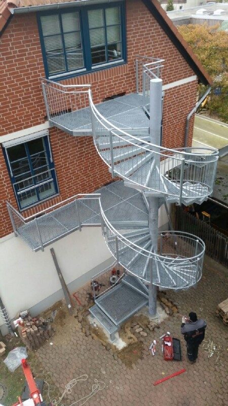 Hergestellt werden sie im Außeneinsatz üblicherweise aus Stahl verzinkt,pulverbeschichtet oder Edelstahl.Einsatz: im Innen- und Außenbereich,als Wohnraumtreppen, Balkontreppen,Industrietreppen als Treppentürme.